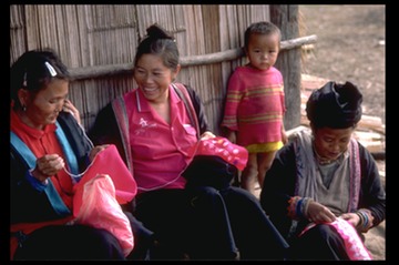 Hmong girl sewing paj ntaub, Bua Chan, Thailand, 1986